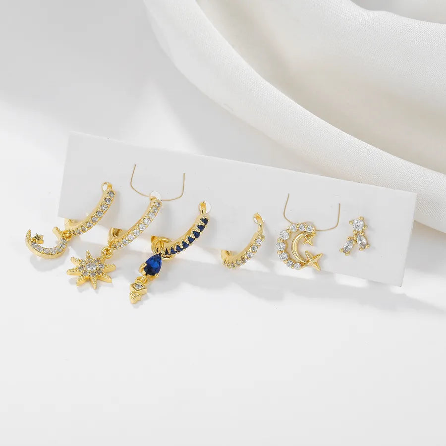 6-Piece Set Sweet Classic Style Moon Inlay Brass Zircon 18K Gold Plated Drop Earrings