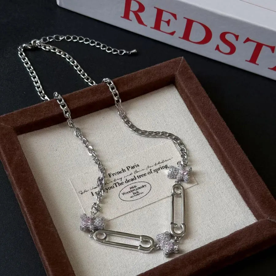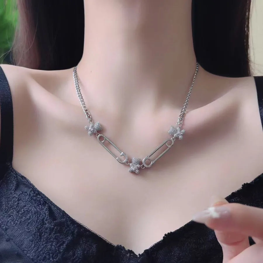 Sweet Girl Micro-Paved Zircon Bear Pin Necklace Women's Luxury Design Sensation Choker Trendy Titanium Steel Animal Pattern