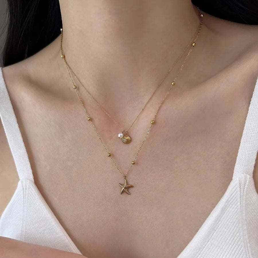 Marine Style Simple Style Starfish Shell 304 Stainless Steel 18K Gold Plated Plating cable chain Double Layer Necklaces